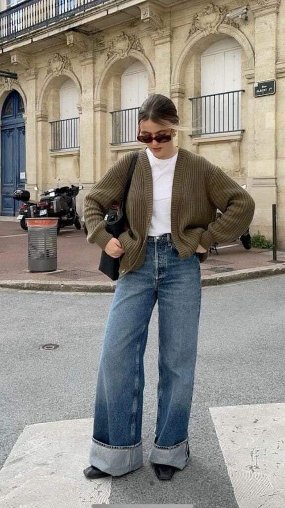 An oversized ribbed cardigan adds warmth and texture to this relaxed, city-ready look. The crisp white tee contrasts perfectly with the classic wide-leg cuffed jeans. Minimal accessories and pointed black shoes complete this blend of cozy and modern style.