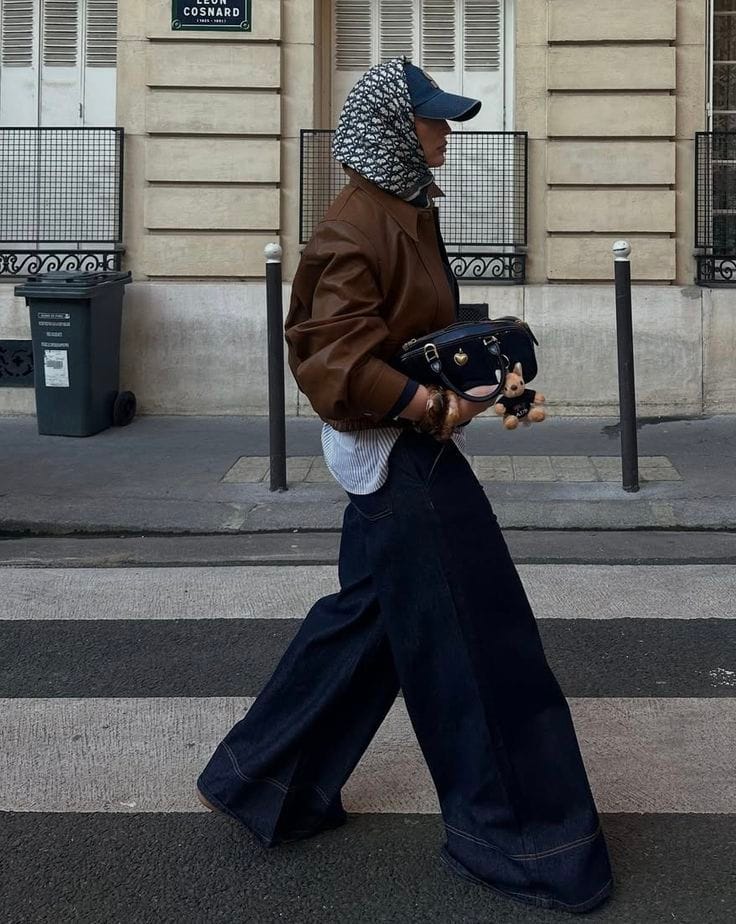 A brown structured jacket takes center stage, layered over a patterned hoodie for an unexpected urban twist. Dark ultra-wide baggy jeans enhance the fashion-forward silhouette, making the look bold and relaxed. Playful accessories and a navy handbag add a whimsical street-style edge.