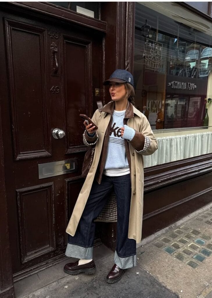A long trench coat with a checked lining exudes classic city style and pairs seamlessly with dark, wide-leg cuffed jeans. Layered underneath, a pale blue sweater, leather jacket, and baseball cap add modern, sporty flair. Chunky loafers ground the outfit, creating a casual yet polished street-ready look.