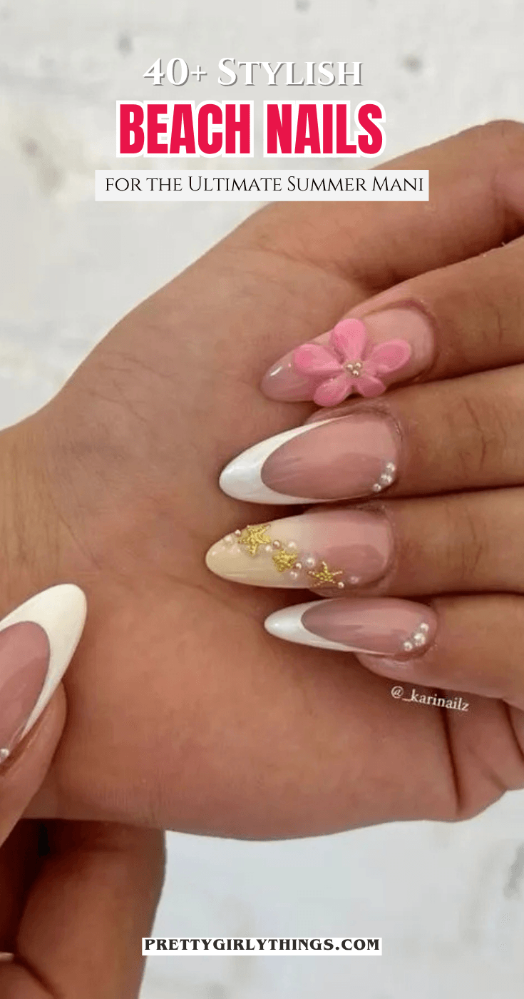 Blush pink almond nails with white French tips dotted in pearls and dainty white daisies are a quietly beautiful beach nail I love for their soft, romantic quality.