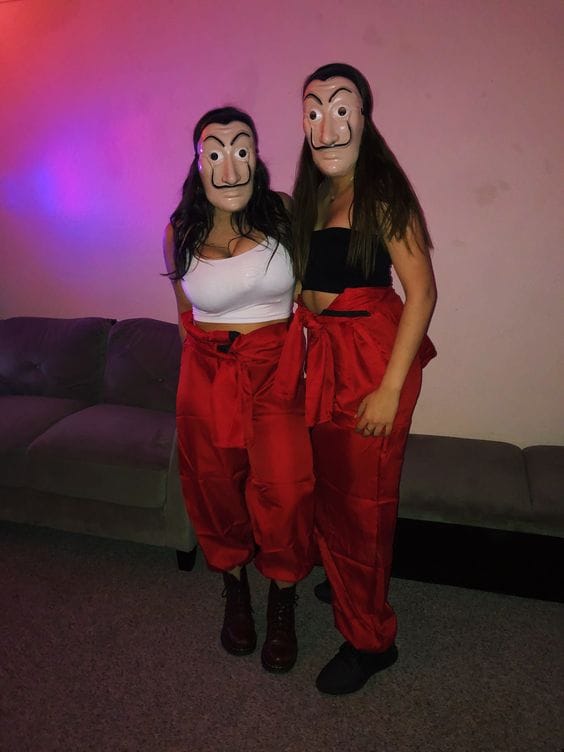 Decked out in iconic red jumpsuits and masks, you and your friend will look like you’re planning the ultimate caper, turning heads with this bold and memorable look.