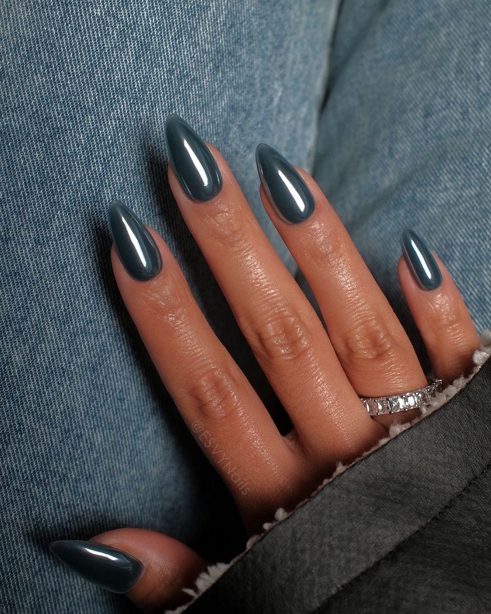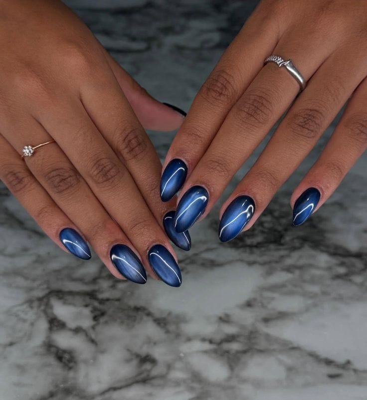 Deep navy blue chrome coats elongated almond-shaped nails, accented by delicate diamond rings for a bold yet romantic sheen.āā