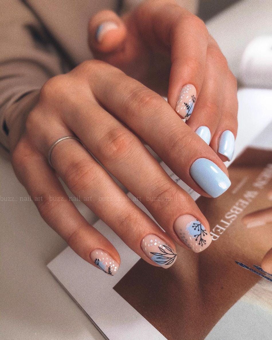 Powder blue nails bloom with minimalist beige leaf motifs on tapered shapes, merging chic elegance and bold romantic whimsy.āā