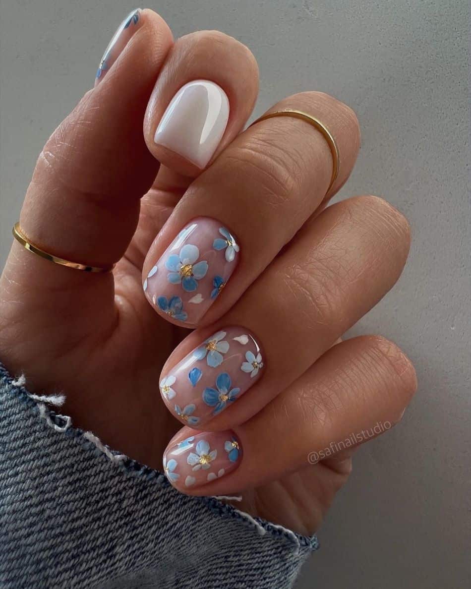 Sheer white nails bloom with petite blue forget-me-not flowers on tapered shapes, infusing chic minimalism with bold romantic tenderness.āā