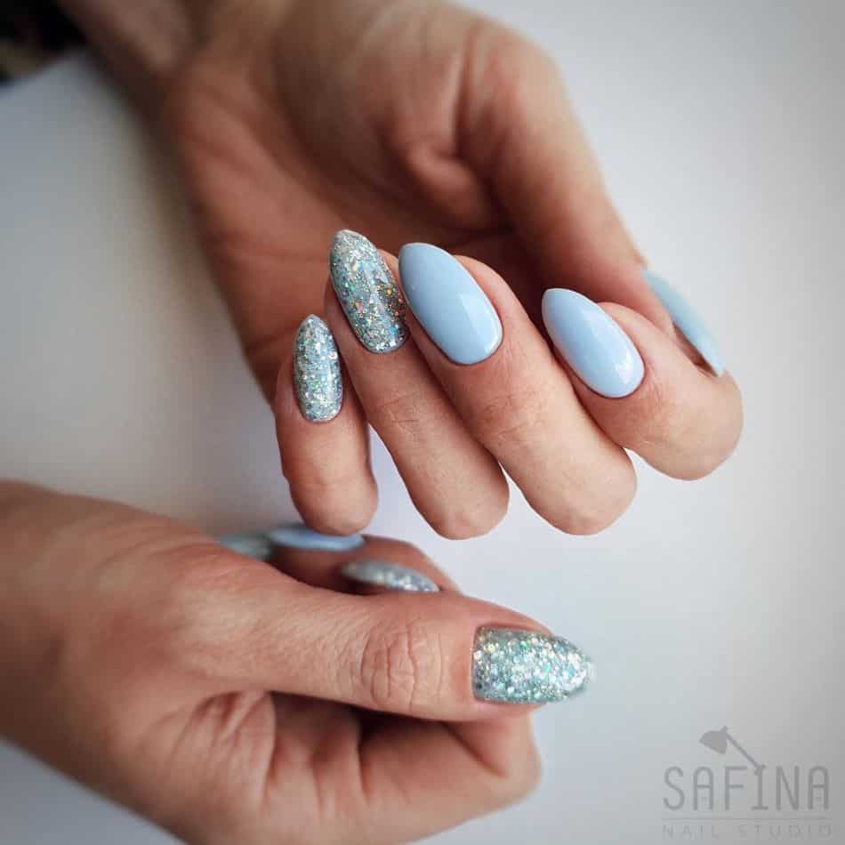 Soft baby blue with fine silver glitter shimmers across pointed stiletto nails, blending chic minimalism and bold romantic sparkle.āā