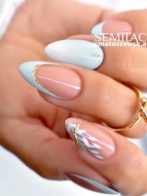 Velvety nude base meets icy blue French tips lined in shimmering gold leaf on almond-shaped nails, for chic minimalism with bold romantic flair.āā