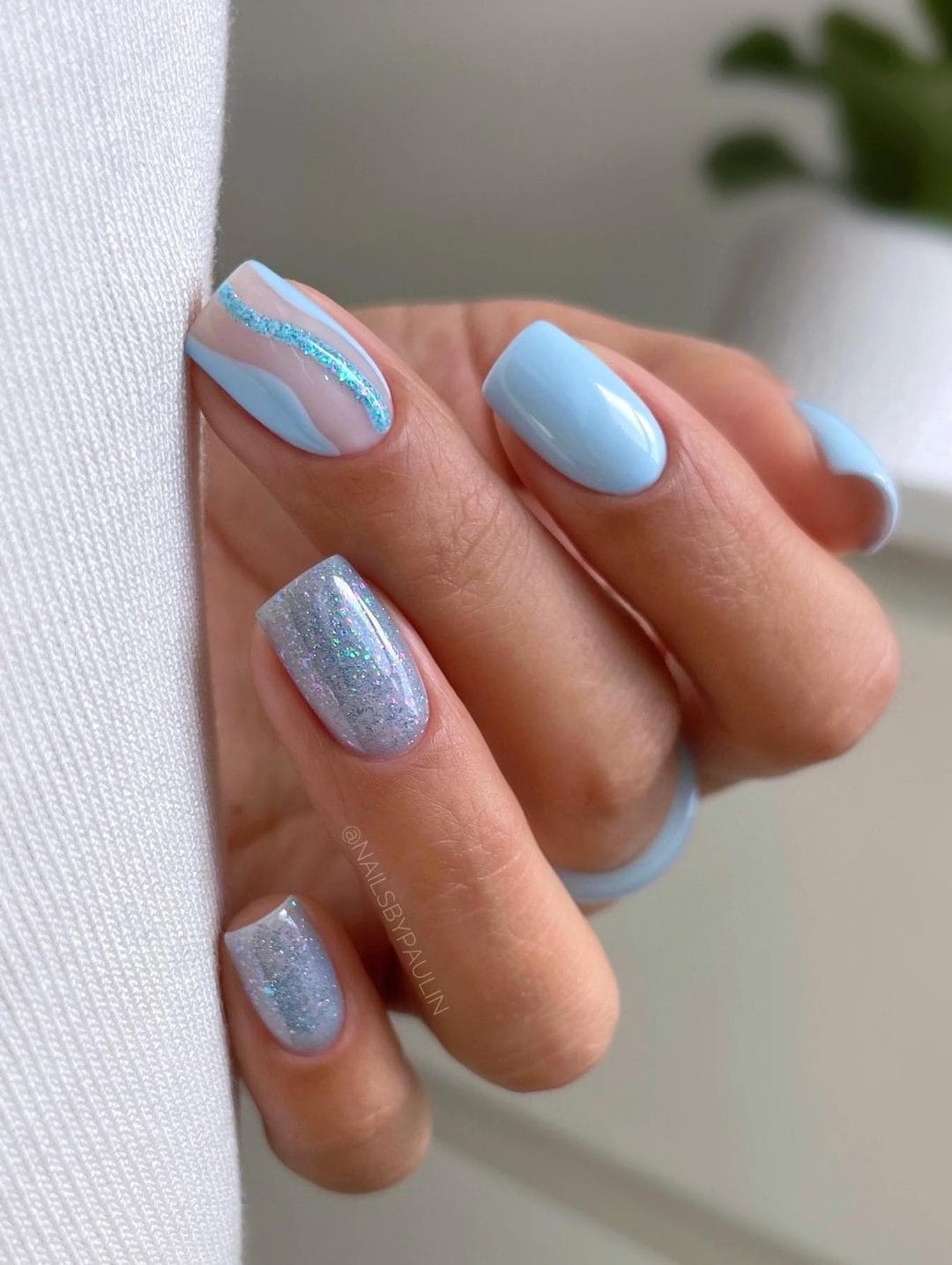 Powder blue square nails gleam with subtle iridescent glitter and a single wavy chrome stripe, evoking chic minimalism with bold romantic allure.āā