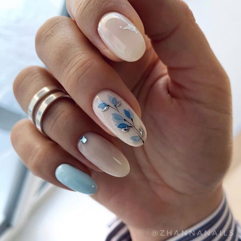 Glossy nude almond nails feature delicate blue leaf branches with crystal accents, balancing chic minimalism and bold romantic subtlety.āā