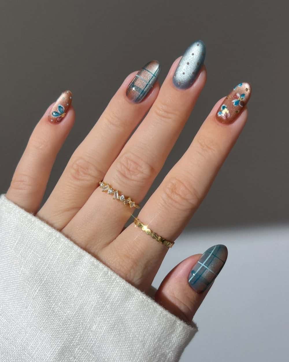 Taupe and metallic blue plaid patterns with subtle gem accents gleam on almond nails, delivering chic minimalism with a bold romantic edge.āā
