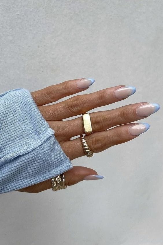 Powder blue tips elegantly curve along almond-shaped nails over a soft nude base, offering chic minimalism with a bold, romantic poise.
