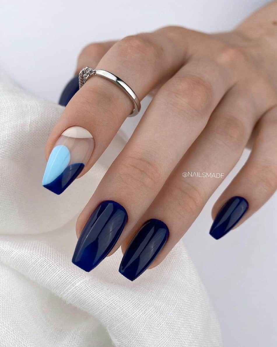 Rich navy base with sheer nude accents and baby blue curved tips defines coffin nails, blending chic minimalism and bold romantic duality.