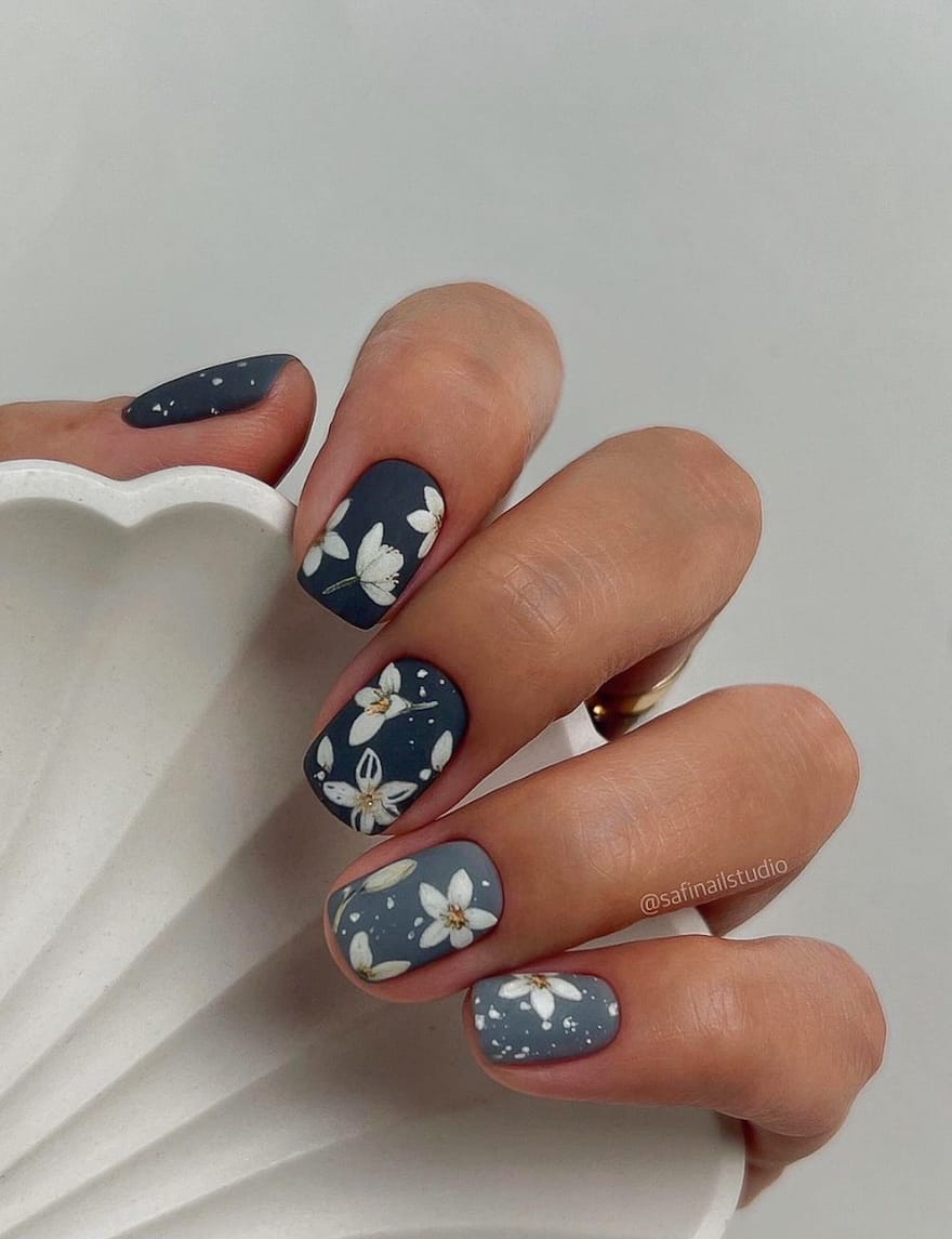 Velvety slate blue base showcases raised 3D white flowers on tapered nails, marrying chic minimalism with bold romantic dimension.ā