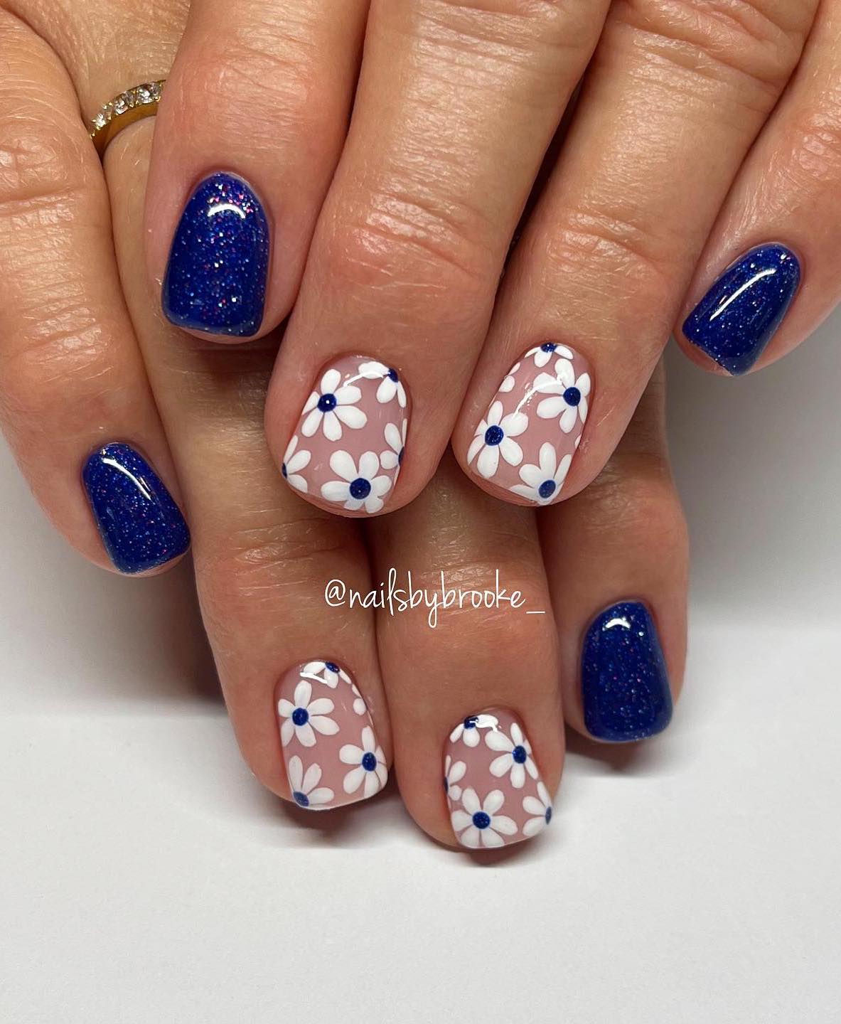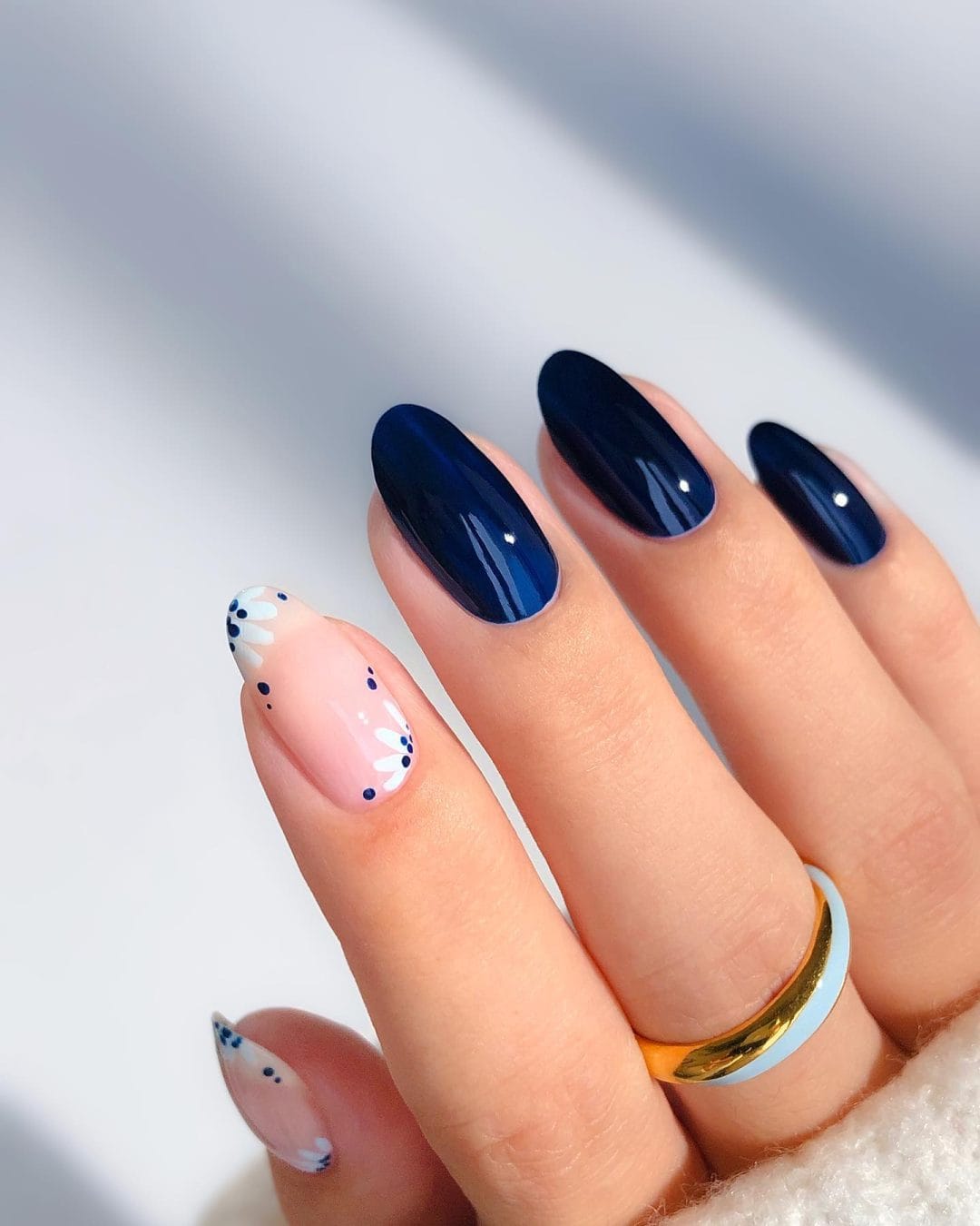 These blue nails feature a glossy deep navy finish on almond-shaped nails, paired with a soft nude base accent nail detailed with delicate white florals and tiny blue dots for an elegant yet bold contrast.