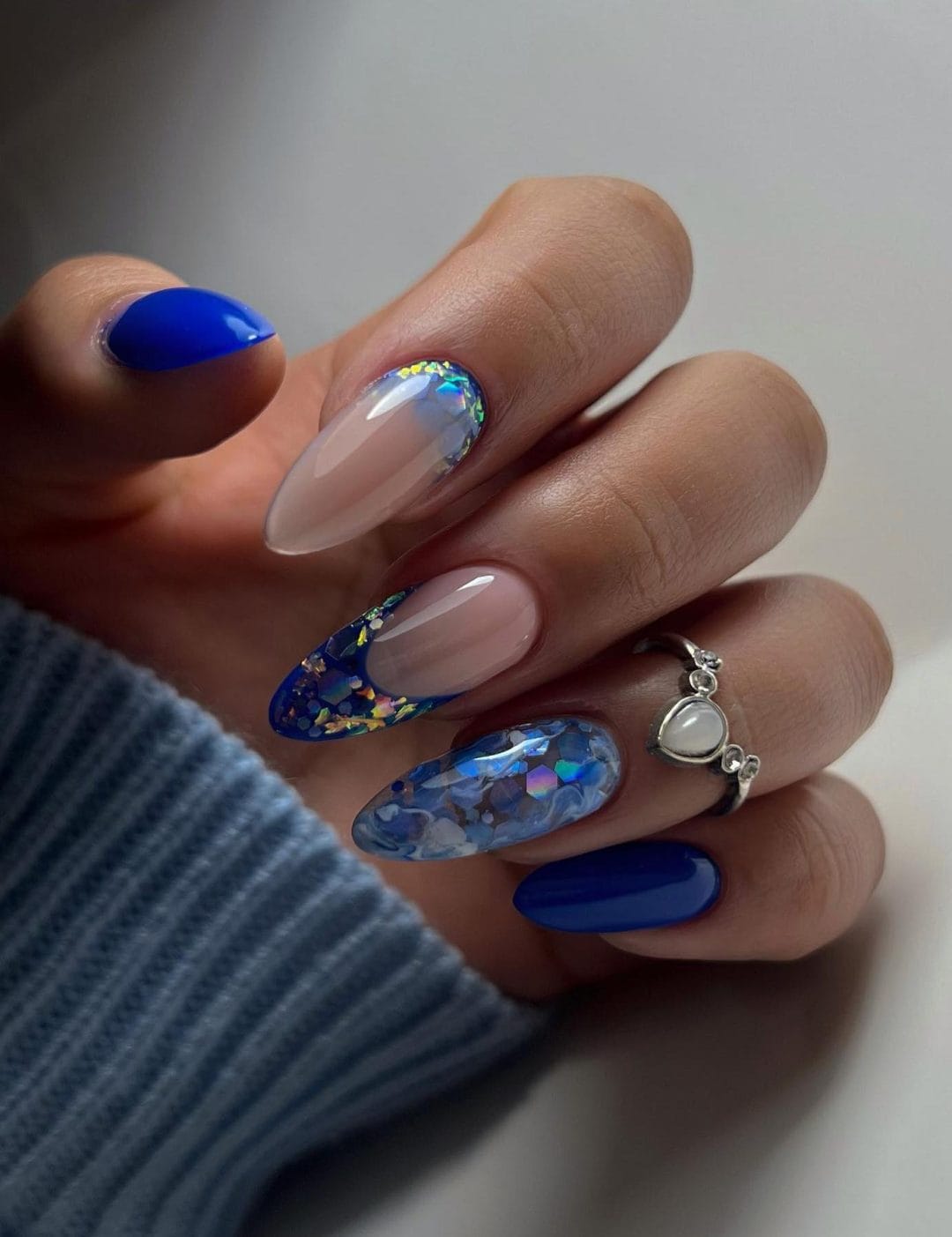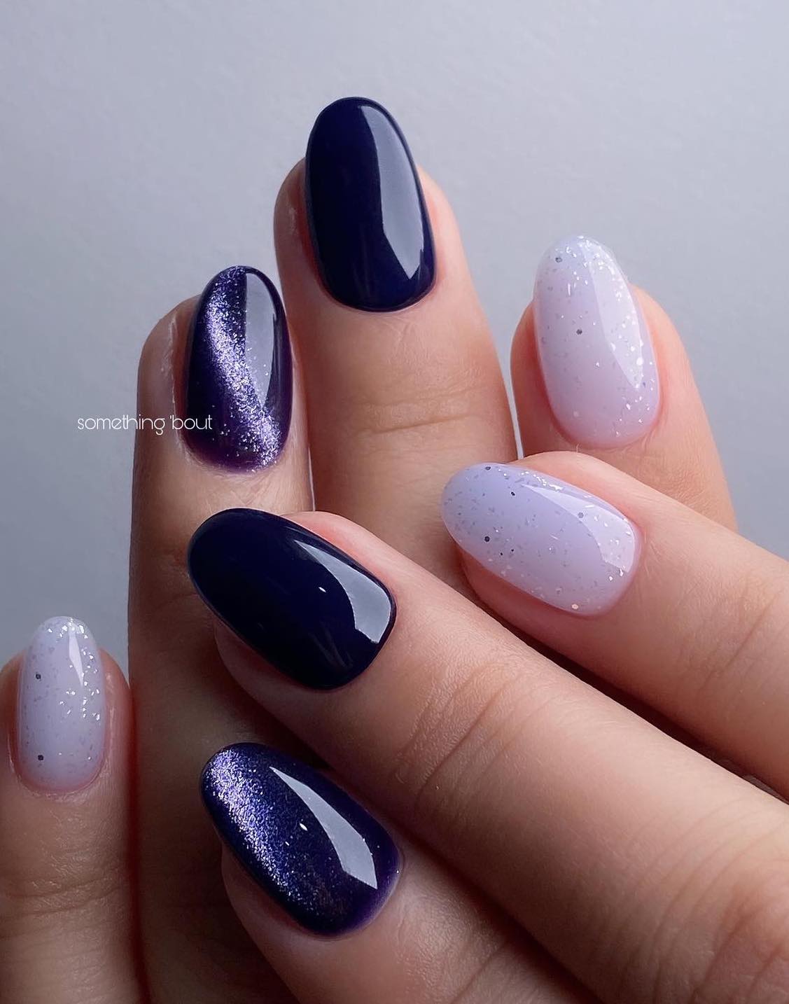 Vibrant navy and soft lilac glitter mingle on tapered almond nails, weaving chic minimalism with bold romantic iridescence.āā