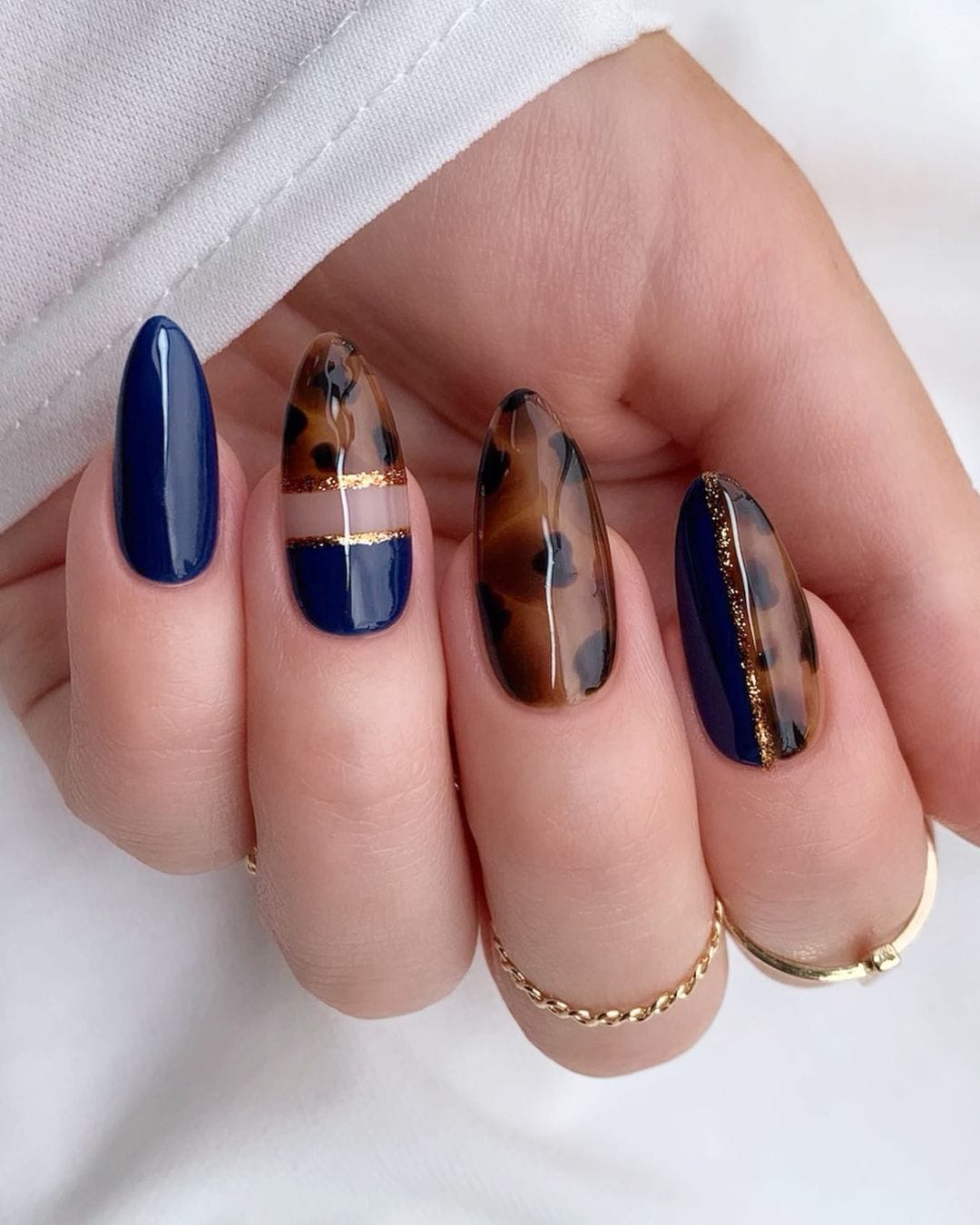 These blue nails combine a glossy navy base with almond-shaped tips, elevated by chic tortoiseshell accent nails and thin gold striping for a bold yet refined finish.