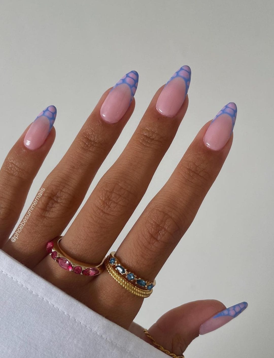 Sheer nude base with periwinkle blue scale-patterned French tips on coffin nails offers chic minimalism with bold romantic texture.āā