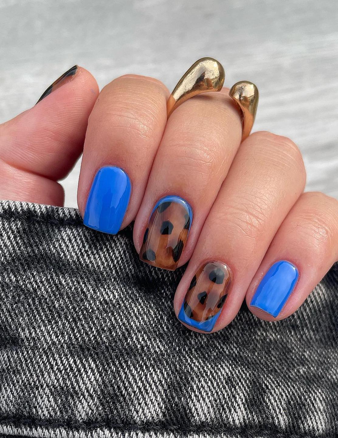 29. Cobalt Blue Short Nails with Tortoiseshell Accent