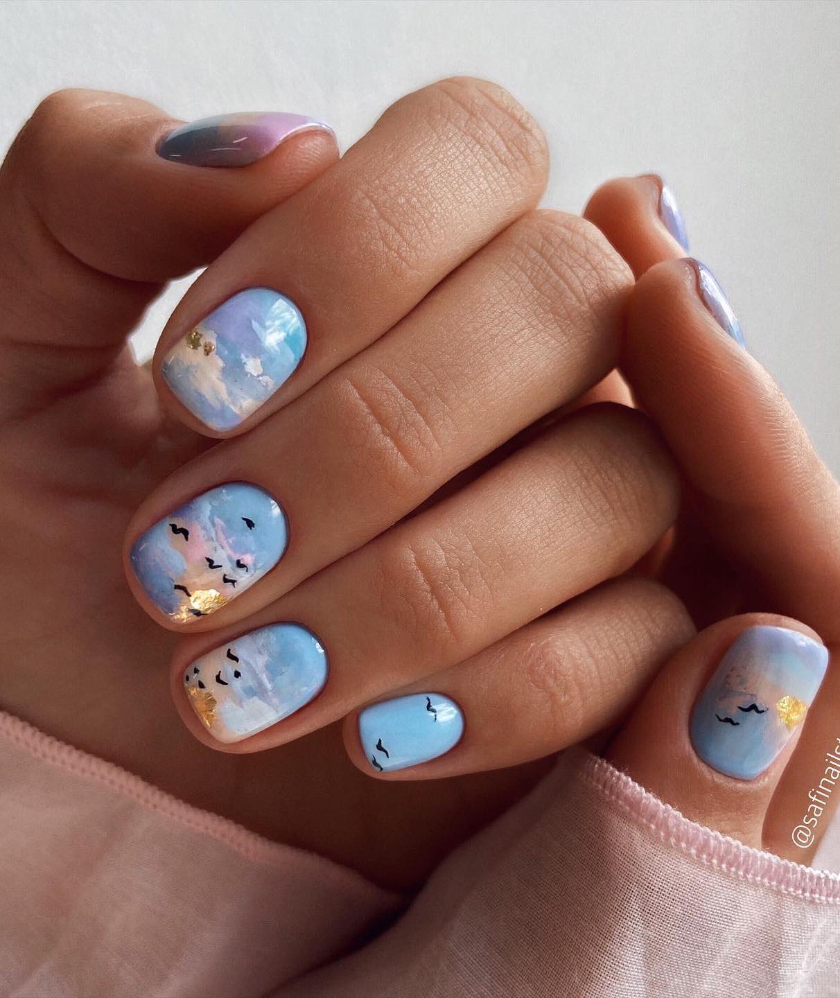 Serene blue skies with fluffy clouds, soaring birds, and subtle gold accents adorn tapered nails, blending minimalist elegance with a romantic, bold allure.āā