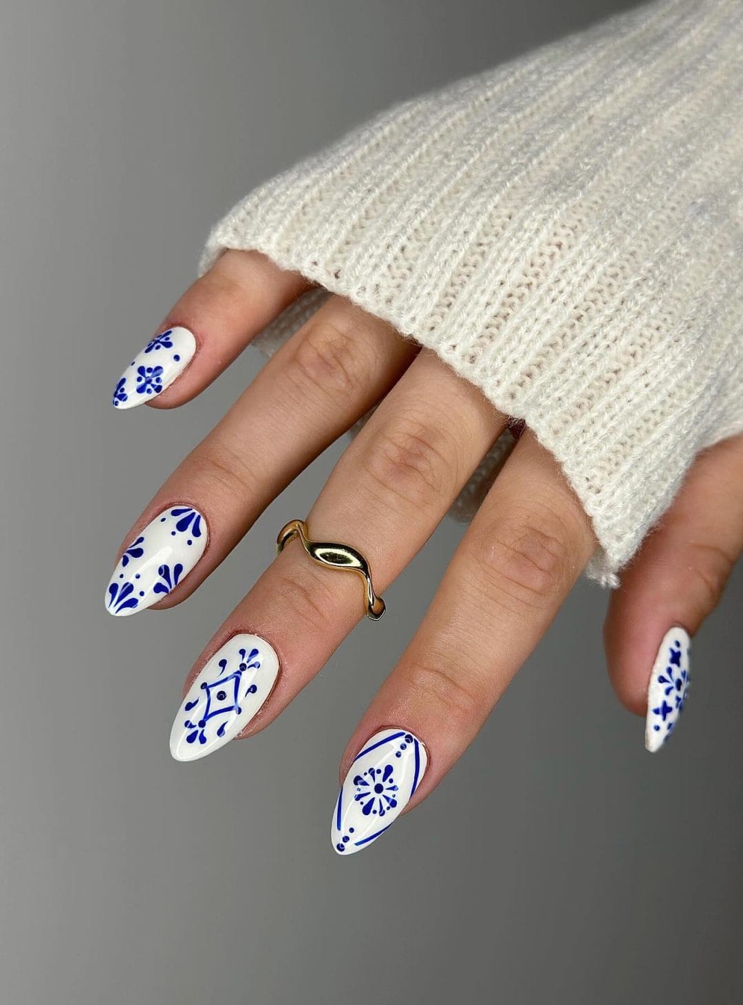 Creamy white base intricately painted with periwinkle blue talavera floral motifs on pointed nails evokes chic minimalism with bold romantic artistry.ā