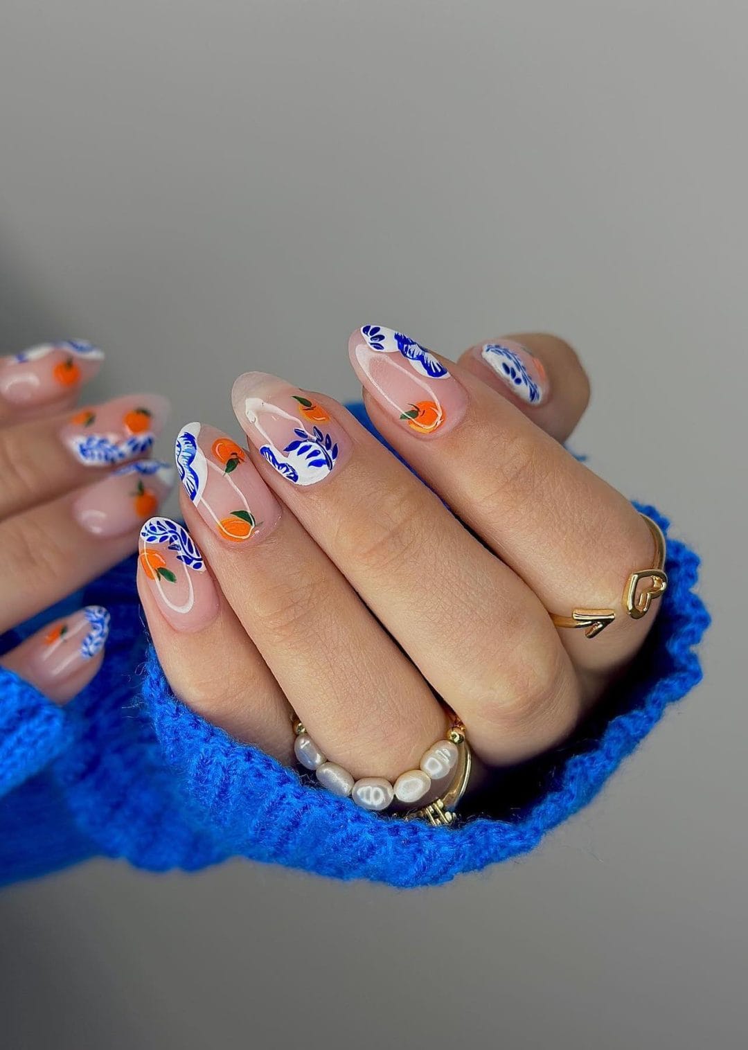 Sheer nude canvas blooms with periwinkle blue talavera swirls and vibrant orange fruits on pointed nails, blending chic minimalism with bold romantic heritage.āā