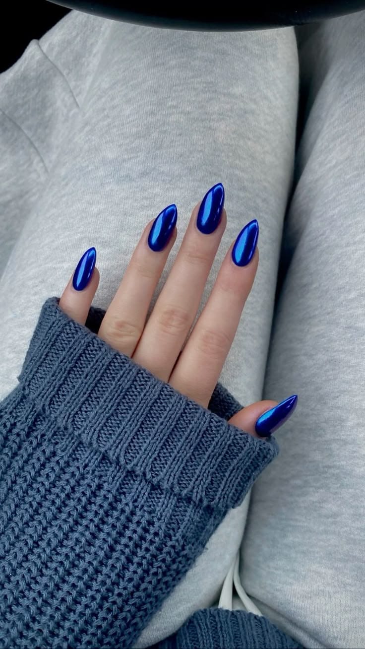 Vibrant royal blue chrome gleams on pointed stiletto nails, fusing sleek minimalism with a bold, romantic intensity.