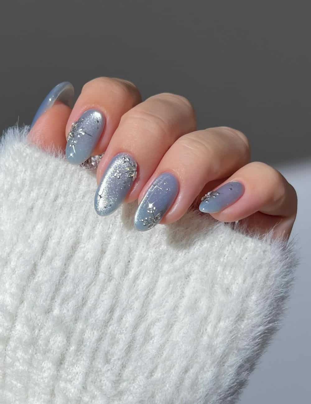Silvery slate blue glitter illuminates almond nails with intricate snowflake motifs, capturing chic minimalism in a bold, romantic winter veil.āā