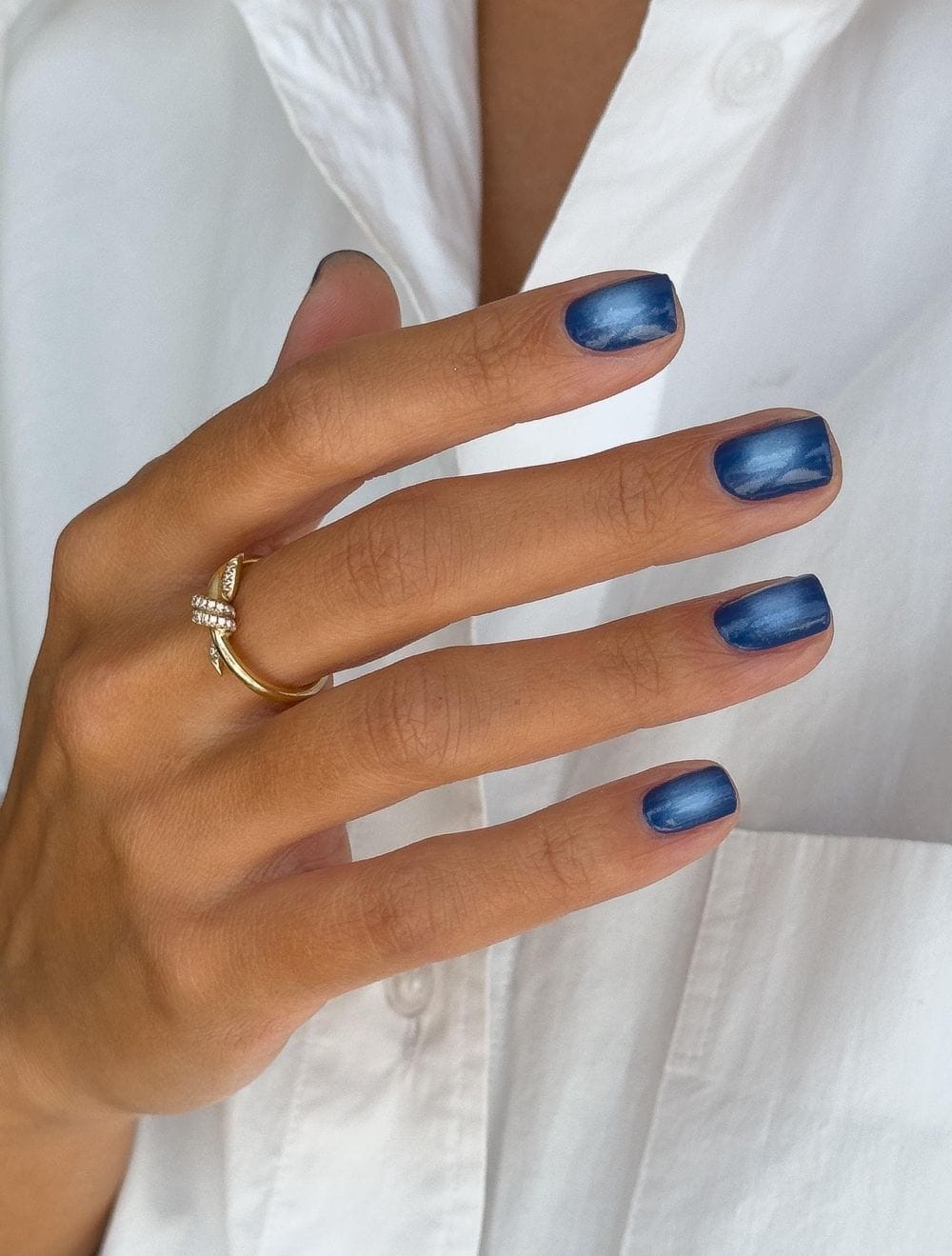 Deep navy chrome envelops square nails in a high-shine finish, embodying chic minimalism with a bold, romantic depth.āā