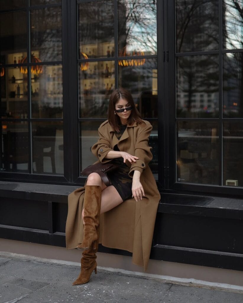 Here’s some chic inspo: she’s rocking an ultra-elegant camel trench coat over a sleek black mini dress, instantly leveling up her vibe. Tall suede brown boots and those cool shades make this look perfect for city strolls and coffee runs!
