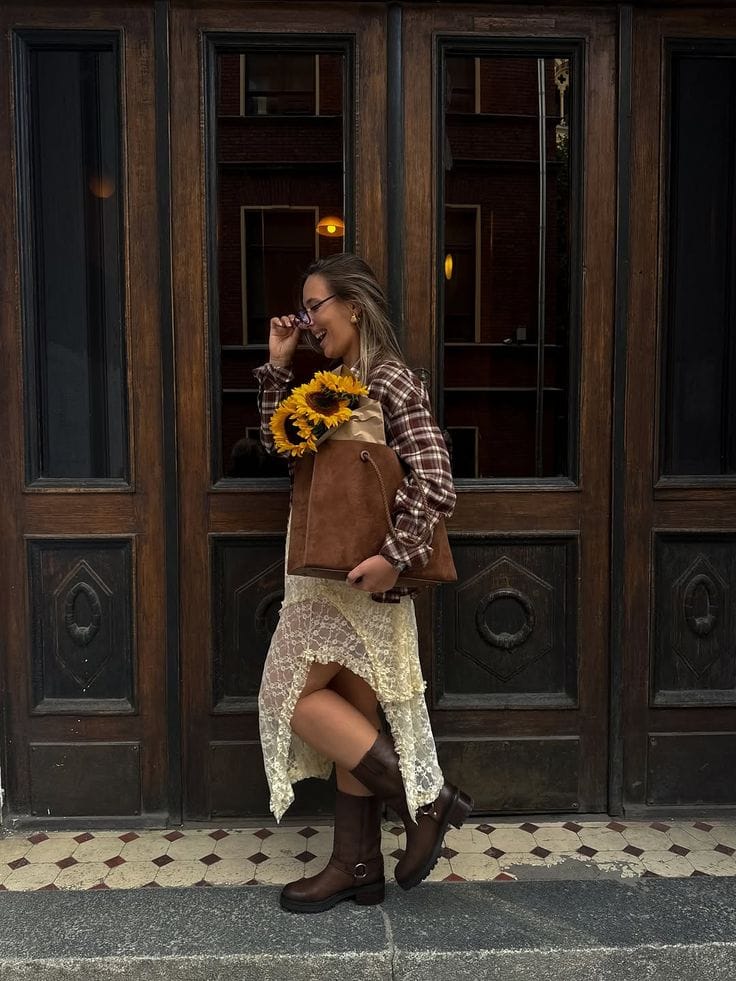 she paired a stylish brown plaid shirt with a dreamy cream lace midi skirt, layering up for those fall vibes. Top it off with chocolate brown boots and a big suede tote for the ultimate chic, on-the-go look!