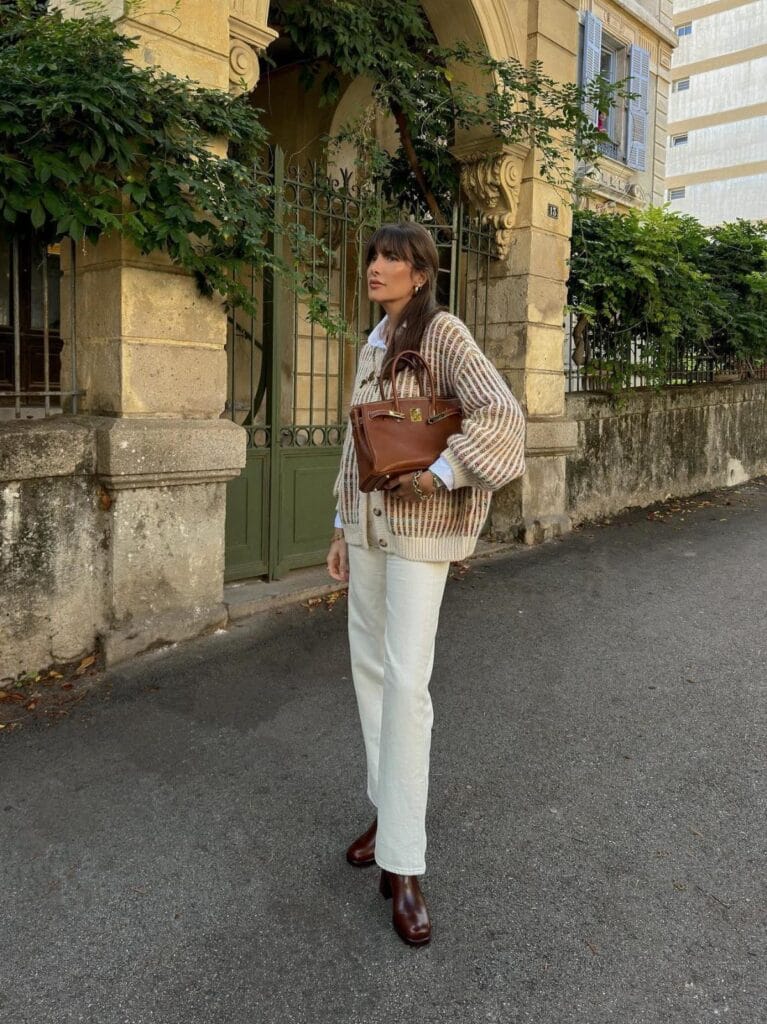 Sheās keeping it relaxed yet polished with a striped chunky cardigan layered over a crisp shirt, paired with cream straight-leg pants and chocolate brown boots. The cozy textures and light tones make this an easy-choice outfit for casual strolls or coffee dates!