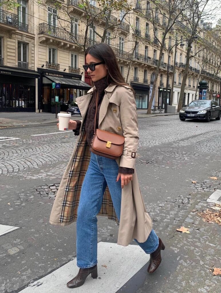 Sheās styled a timeless trench coat over a dark turtleneck sweater and classic straight-leg blue jeans, and finishes the look with rich brown ankle boots and a chic crossbody bag. Effortlessly Parisian, this outfit is your go-to for cozy coffee runs and crisp city strolls!