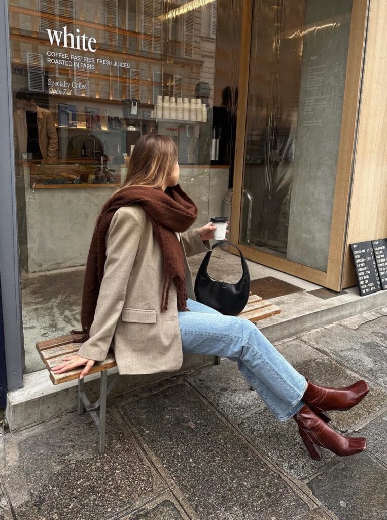 Here sheās gone for an easy-going beige blazer, with a chunky brown scarf wrapped around her shoulders, teamed with light-wash straight jeans and bold brown block-heeled boots. Cozy, effortlessly chic, and absolutely made for coffee dates in the city!