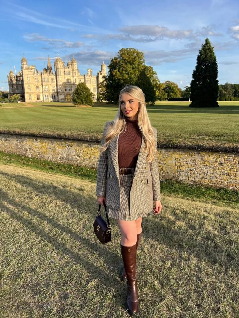 Sheās wearing a charming checkered blazer with a matching mini skirt, styled over a rich brown turtleneck, and topped off with sleek knee-high brown boots for that refined countryside vibe. This look is pure English manor energyāseriously, so timeless and elegant!