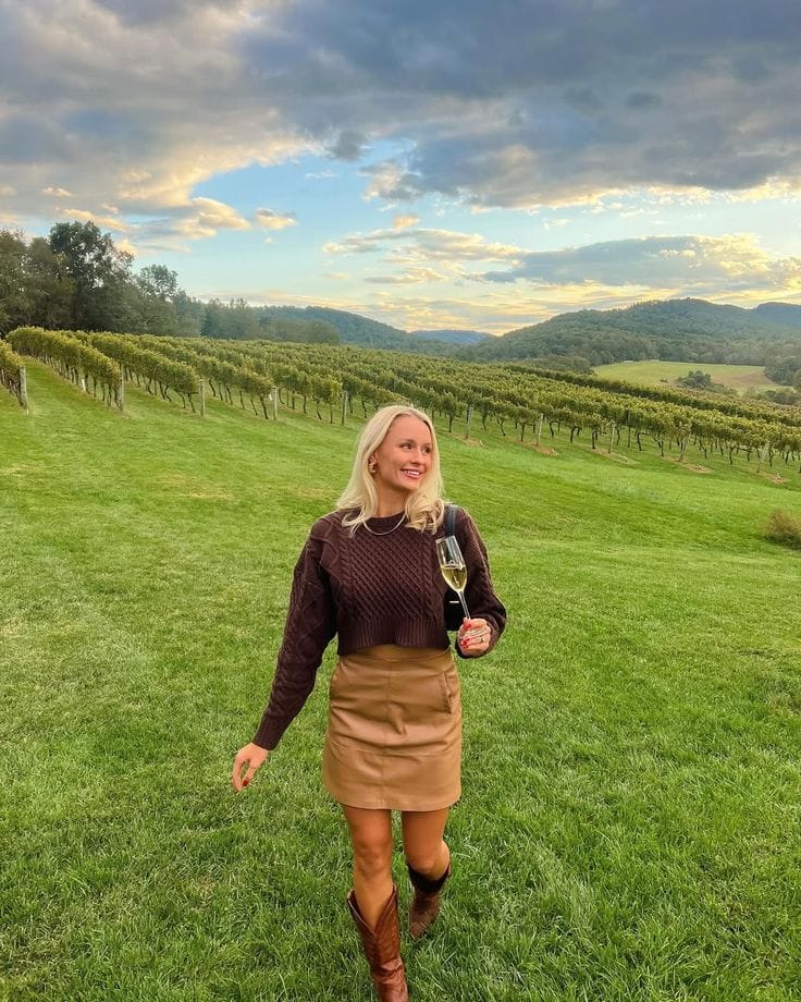 Sheās styled a chocolate brown cable-knit sweater with a soft tan leather mini skirt and finished the look with versatile brown Western boots. This outfit is such a vineyard dreamācasual, cute, and ready for golden hour sipping!