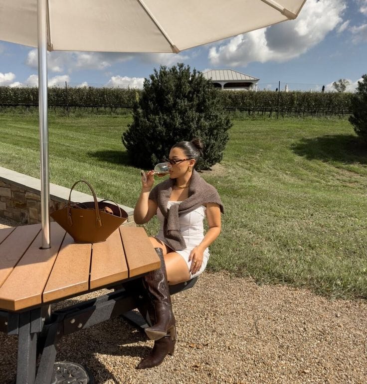 Sheās rocking a crisp white mini dress with a chunky brown knit sweater draped across her shoulders, and finishes it off with classic brown cowboy boots. This look just screams easy vineyard chicātotally perfect for sunny days and wine tastings outdoors!
