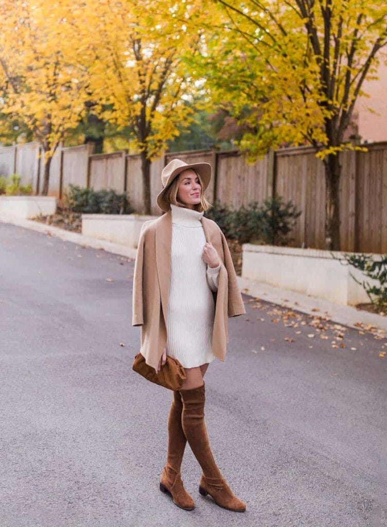 Sheās bundled up in a ribbed ivory turtleneck sweater dress with a drapey camel coat over her shoulders, a matching camel hat, and soft brown suede over-the-knee boots. Dreamy fall vibesāthis outfit is the definition of timeless autumn elegance!