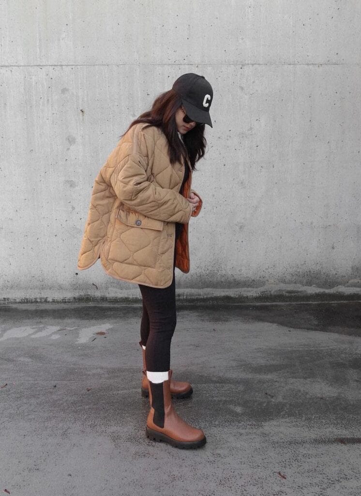 Major cozy-cool points for this oneāsheās bundled up in an oversized quilted tan jacket and teamed it with fitted black leggings, nailing a sporty-chic vibe. Chunky brown Chelsea boots, white socks, and that baseball cap tie it all together for a relaxed but stylish look!