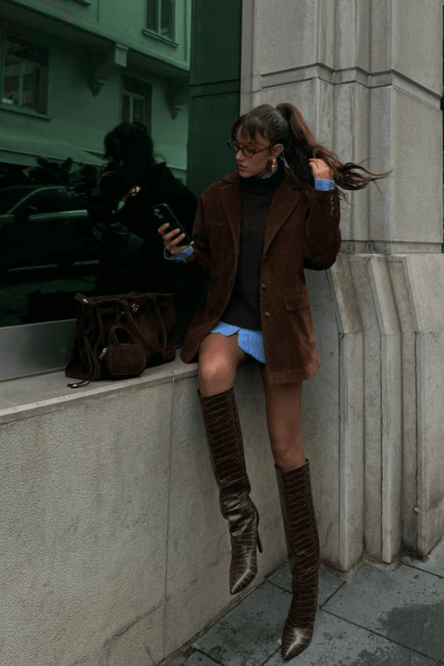 Serving major city-girl vibes, she styled a plush brown blazer over a classic black turtleneck and layered it with the hem of a blue shirt dress peeking out. The look is finished with textured brown knee-high boots and a coordinating tote for that effortlessly polished finish!