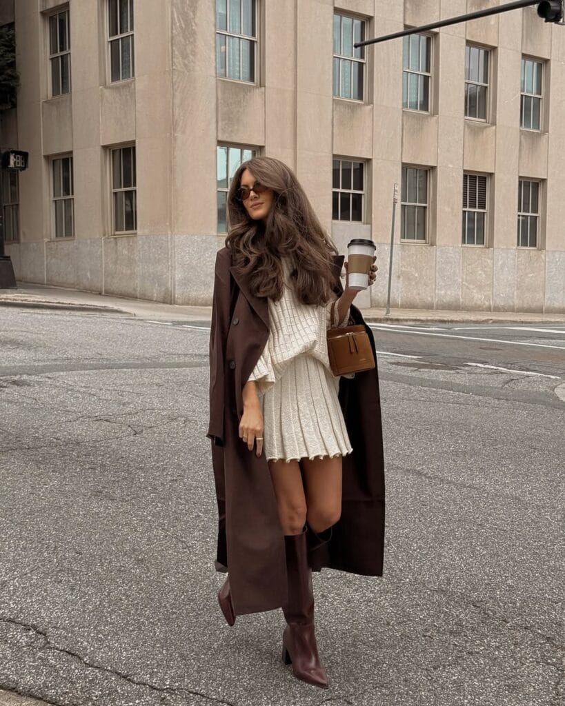 Obsessed with this city-ready lookāshe’s layered a luxe chocolate brown coat over a textured cream knit mini dress for that perfect balance of cozy and polished. Add tall brown boots and a structured brown purse, and you’ve got major fall fashion goals, coffee in hand!