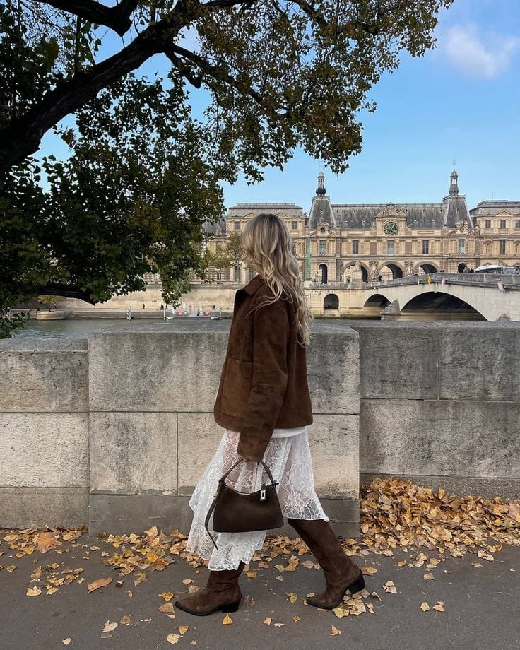 This Parisian-inspired look features a rich brown shearling jacket layered over a romantic white lace midi dress, blending soft and structured so perfectly. Paired with knee-high brown boots and a matching handbag, it’s the ideal outfit for stylish autumn strolls!