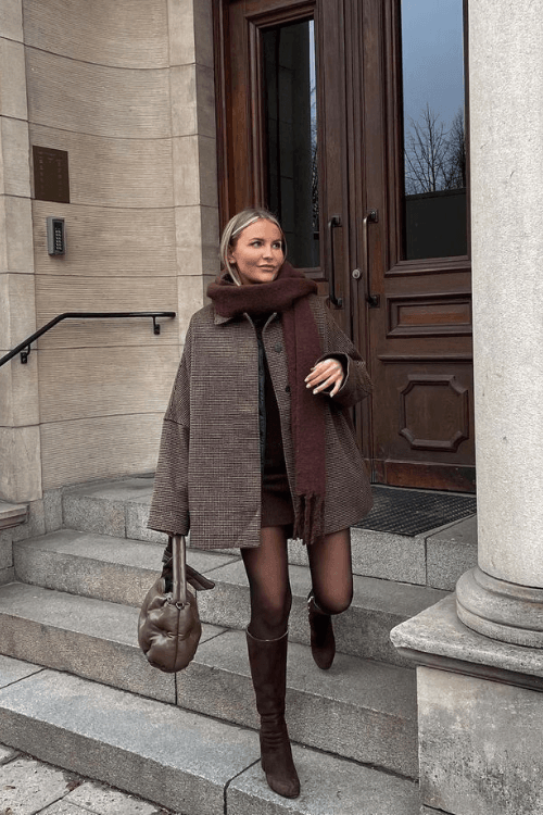 This outfit is winter street-style perfectionāsheās wrapped up in a rich brown plaid jacket and matching scarf, paired with a short brown mini skirt and dark tights. Finish it off with snuggly brown knee-high boots and a slouchy quilted handbag for that cozy-chic vibe!