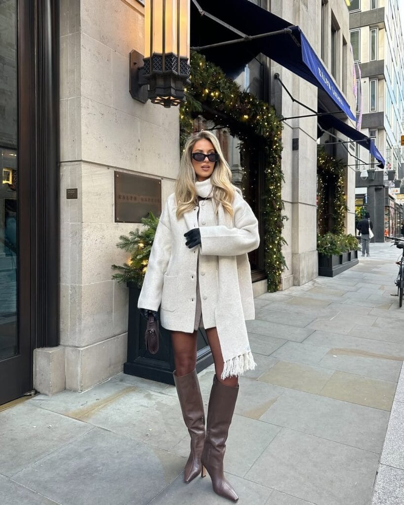 She looks effortlessly chic in an elegant ivory coat paired with a matching scarf and a cozy mini underneath, perfect for a crisp winter day. Brown knee-high boots and black gloves tie together this polished, city-girl look!