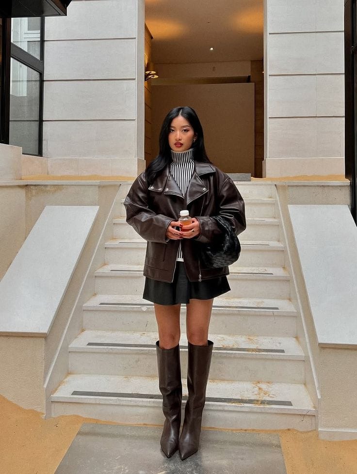 Loving this bold lookāshe’s rocking a sleek dark chocolate leather biker jacket layered over a black and white striped turtleneck and a dark mini skirt for that perfect modern edge. Knee-high brown boots complete the outfit, giving serious boss energy wherever you go!