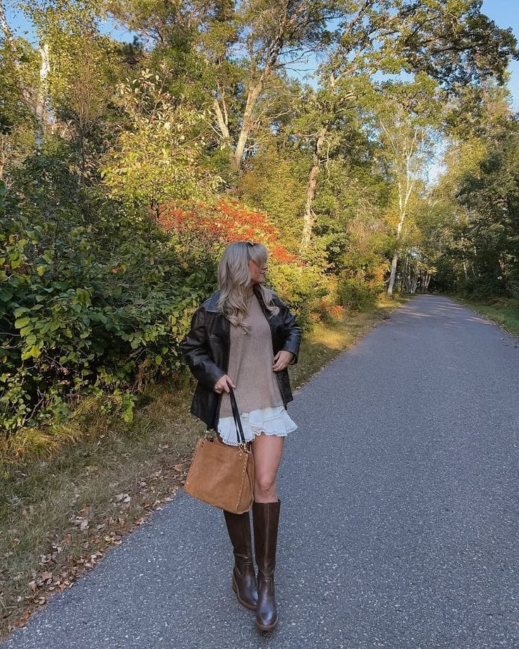 This look is pure fall forest magicāsheās layered a taupe chunky sweater over a white ruffled mini dress for that dreamy, woodland vibe. Finish it with a classic black leather jacket and tall chocolate boots, and youāre set for an autumn adventure!