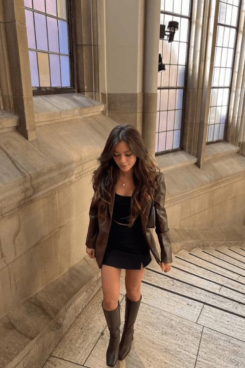 This look is timeless and sleekāshe styled a glossy brown blazer over a fitted black mini dress, making it effortlessly elevated. Add in those classic brown knee-high boots and youāre ready to turn any hallway into a runway!