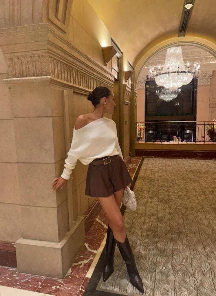 Giving all the luxe hotel vibes, she styled an off-shoulder cream knit sweater with high-waisted brown belted shortsāsuch an effortlessly chic pairing. Just add classic pointed brown boots and a mini woven clutch for that polished, ready-for-anything look!