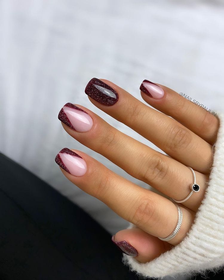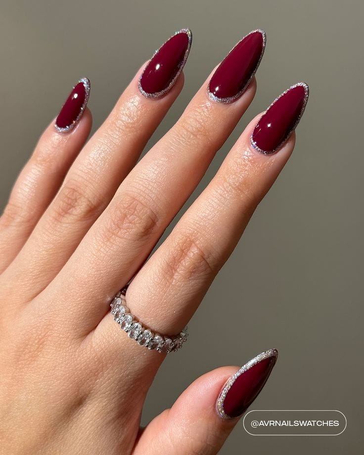 Glitter burgundy nails add a touch of dazzle to your chic manicure.