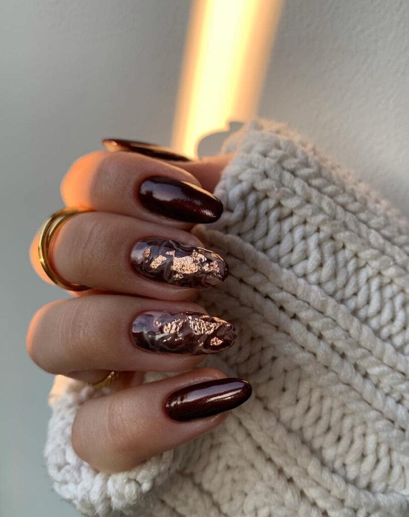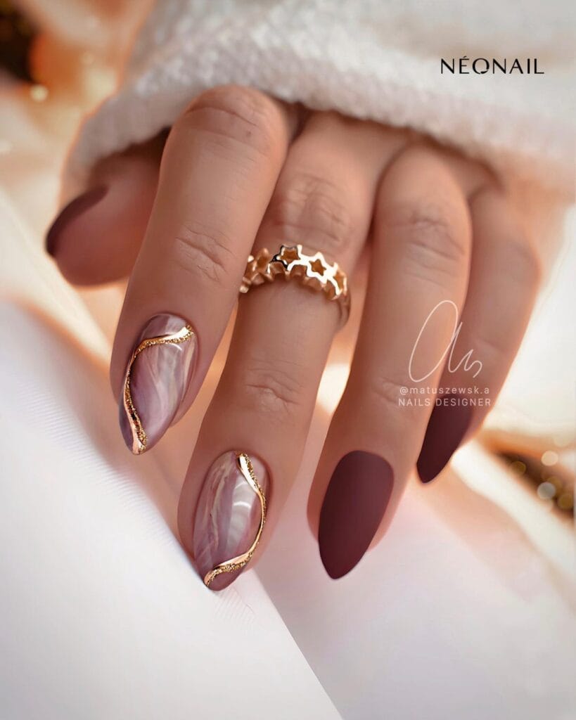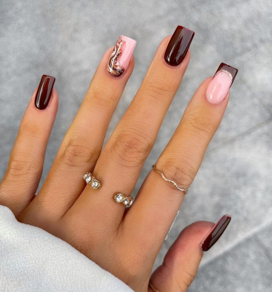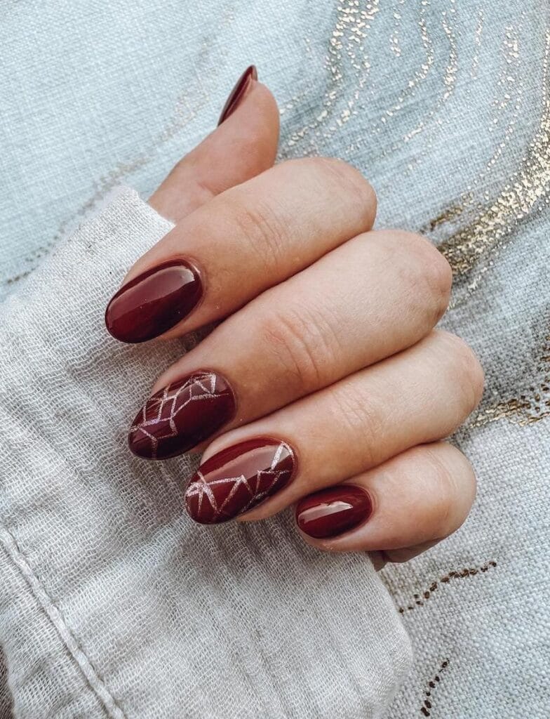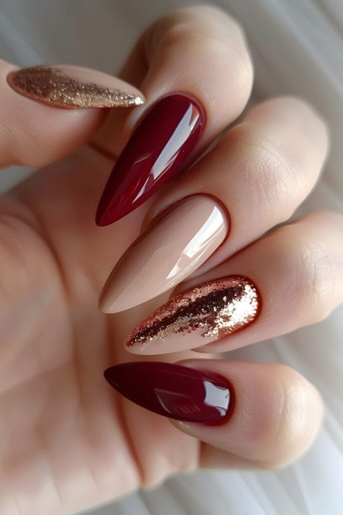 Gold and burgundy nails combine the richness of burgundy with the sparkle of gold for a luxurious look.
