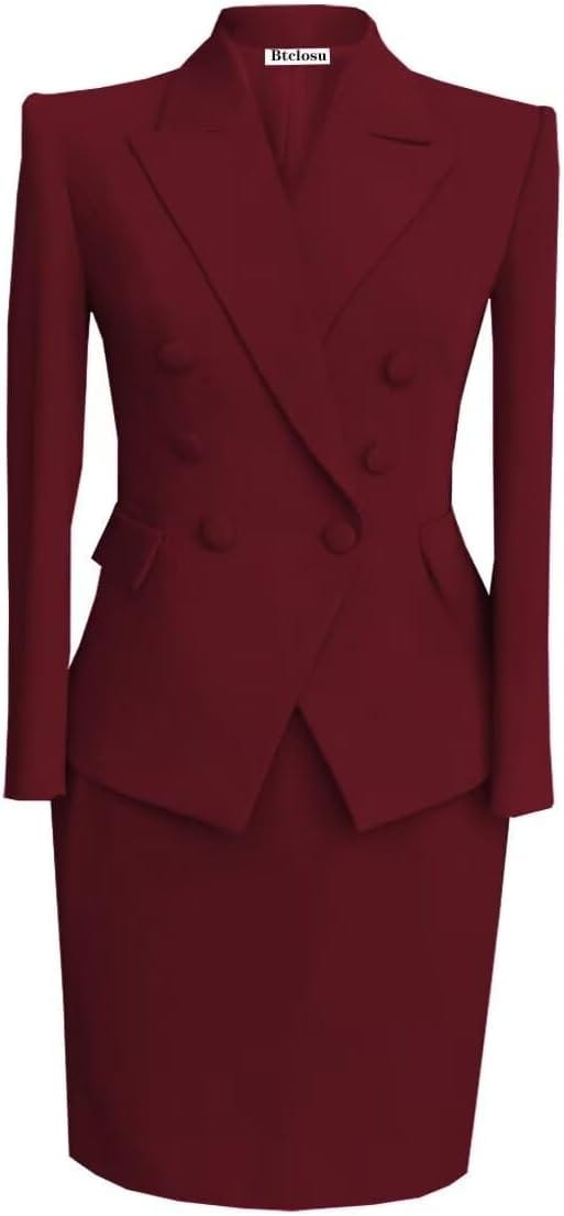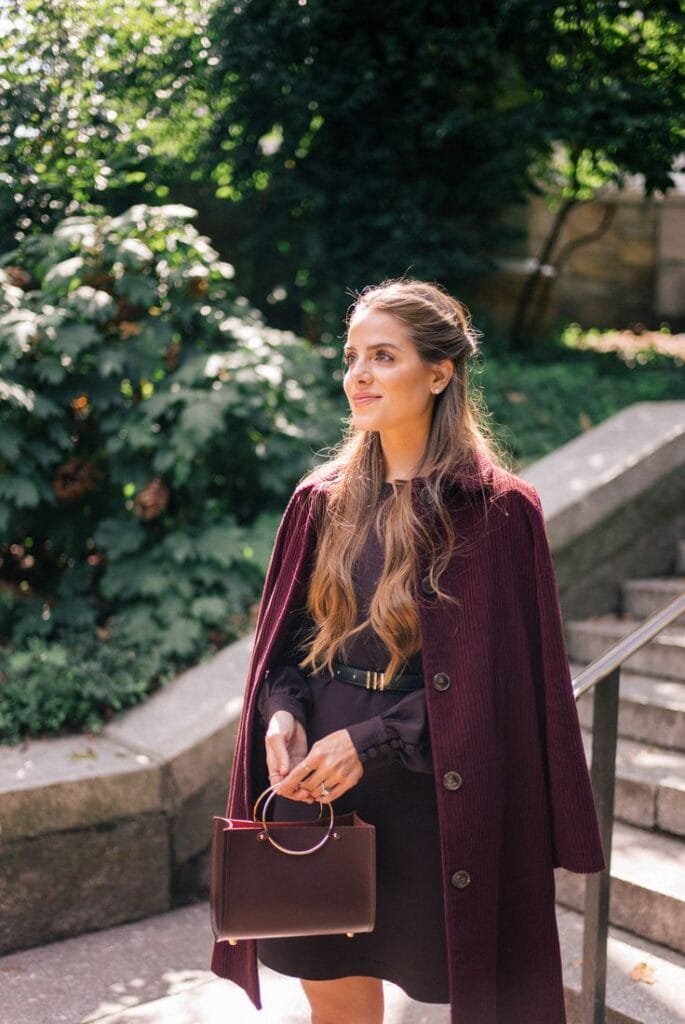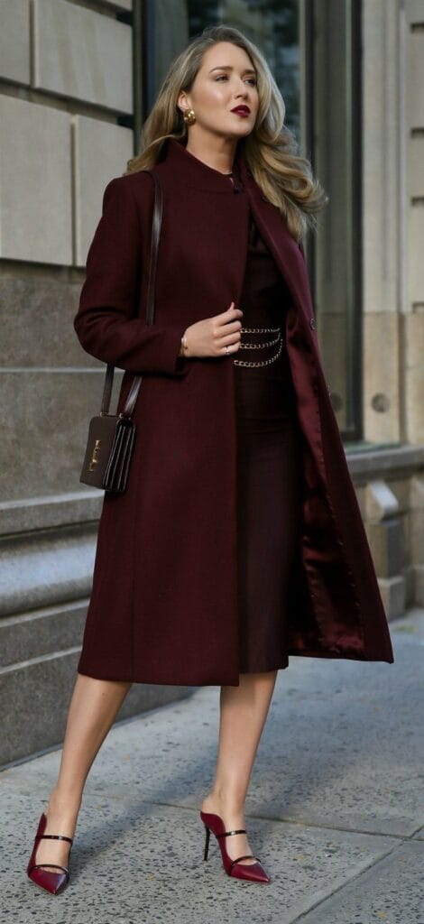 This outfit features a tailored burgundy coat paired with a sleek black dress and statement heels.