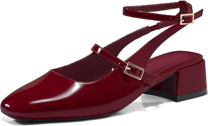 The deep red accessories, including the bag and flats, elevate the look with subtle elegance.